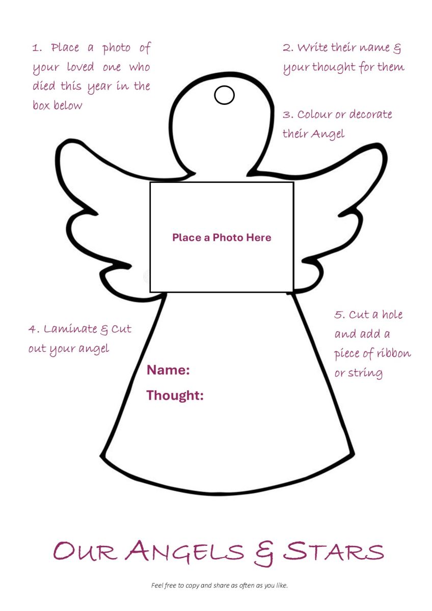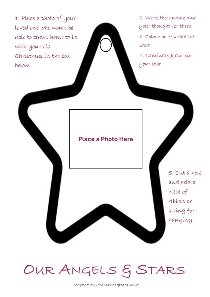 Create an Angel for loved ones who have died, and a Star for those who cannot be with you this year and hang them on your Christmas tree at home.